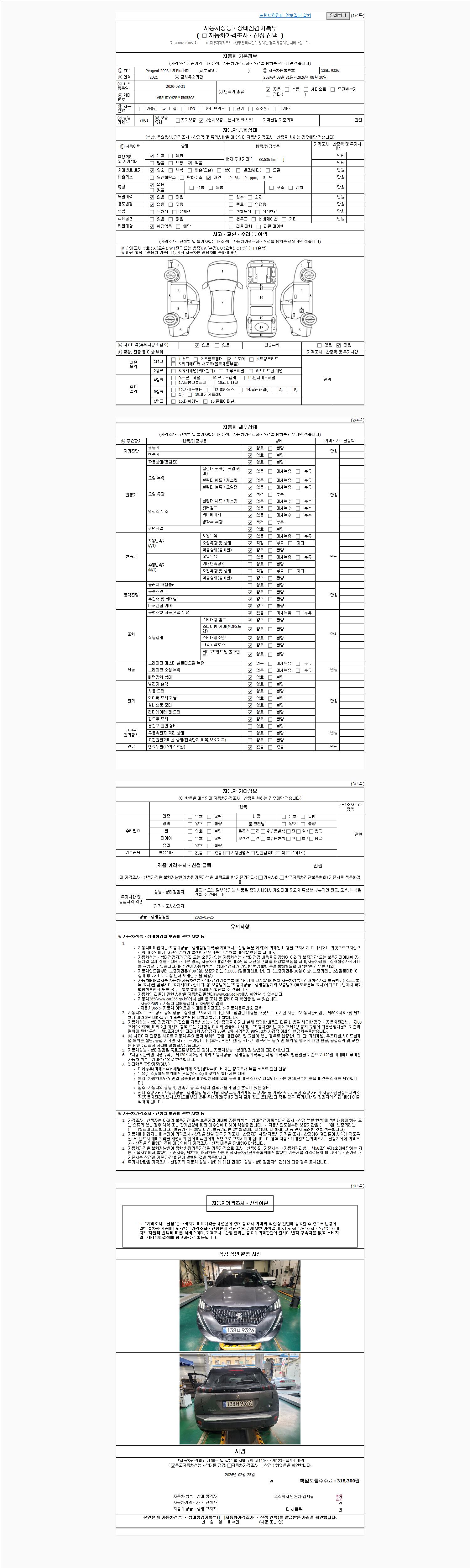 | 주행거리 | 88,636 km | 차량번호 | 138너9326 | 사고유무 | 성능기록부 참조 | 제시번호 | 제 2026009864 호 |