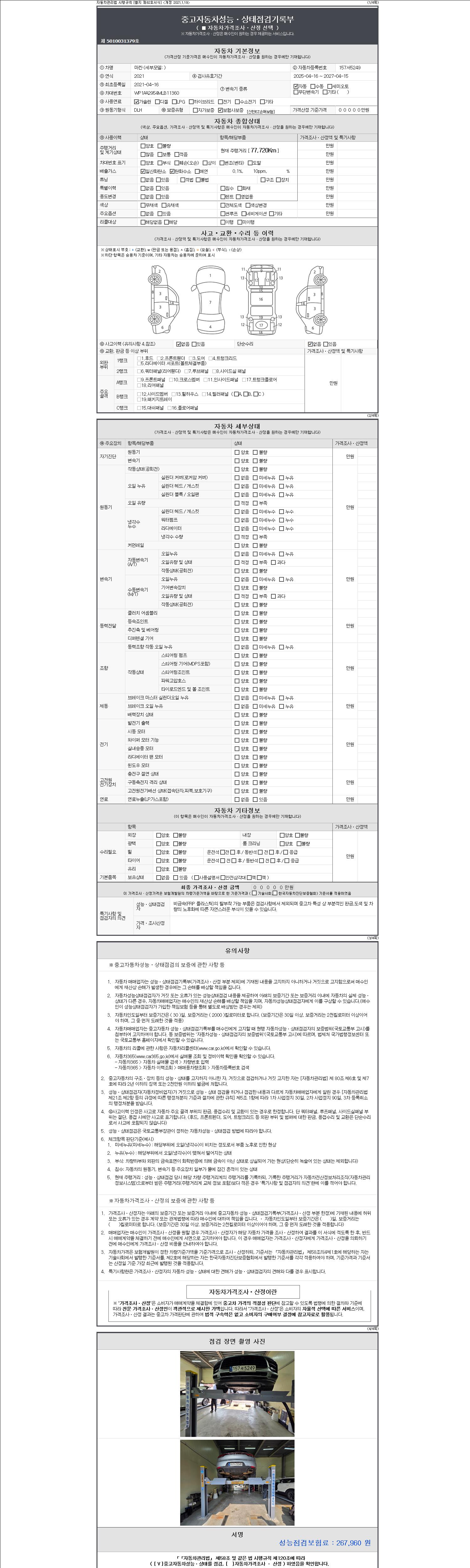 | 주행거리 | 77,720 km | 차량번호 | 157서5249 | 사고유무 | 성능기록부 참조 | 제시번호 | 제 2147483647 호 |