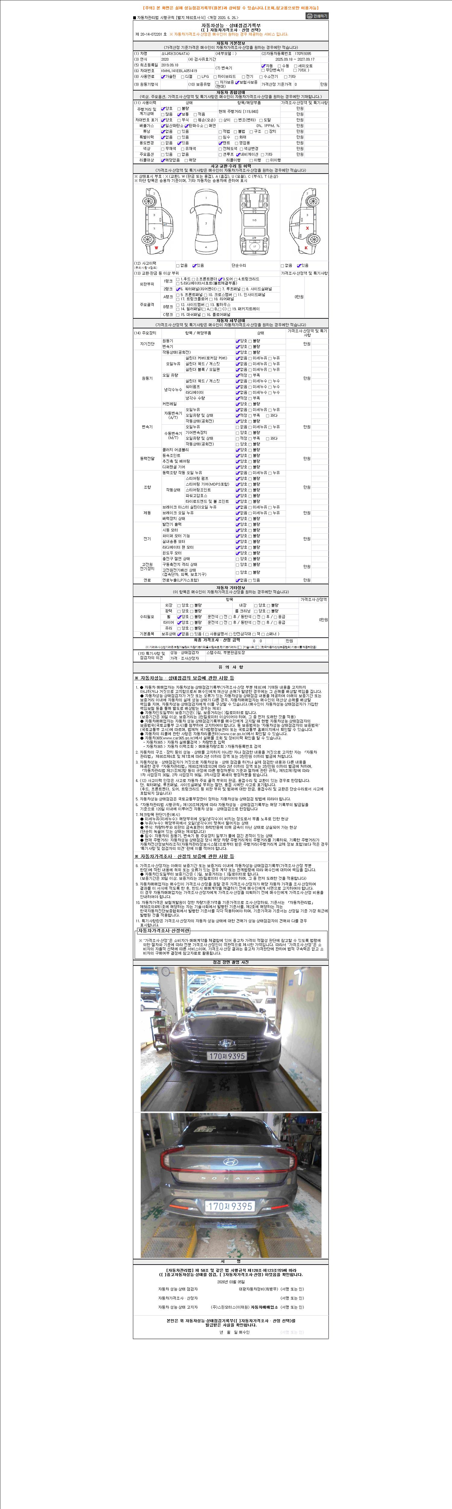 | 주행거리 | 119,840 km | 차량번호 | 170저9395 | 사고유무 | 성능기록부 참조 | 제시번호 | 제 2026025659 호 |