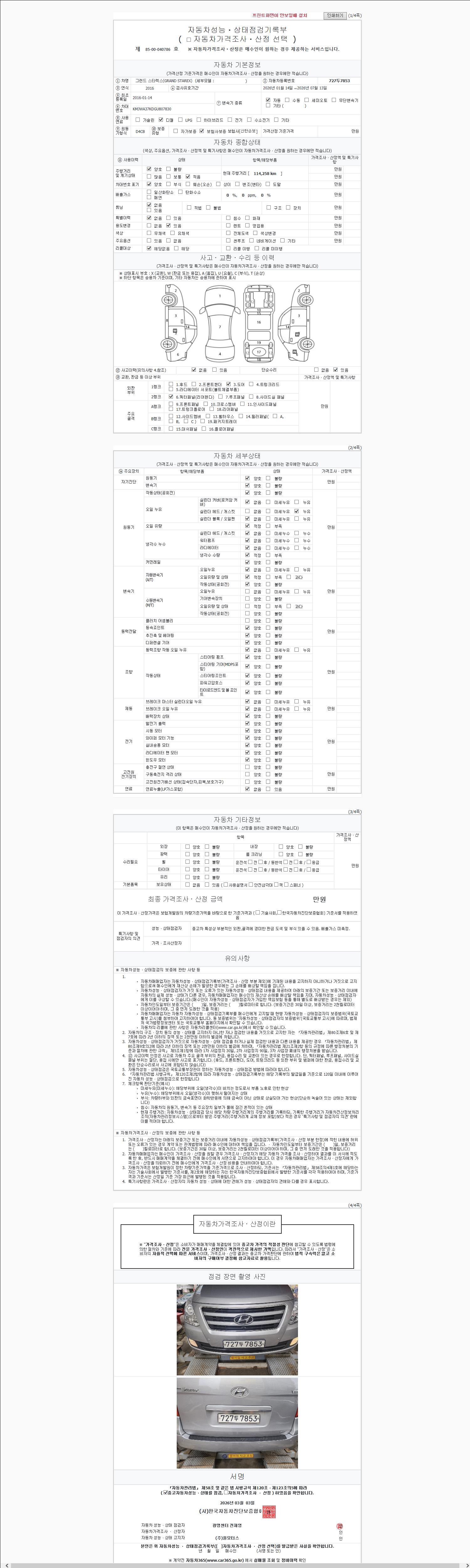 | 주행거리 | 114,258 km | 차량번호 | 727두7853 | 사고유무 | 성능기록부 참조 | 제시번호 | 제 2147483647 호 |