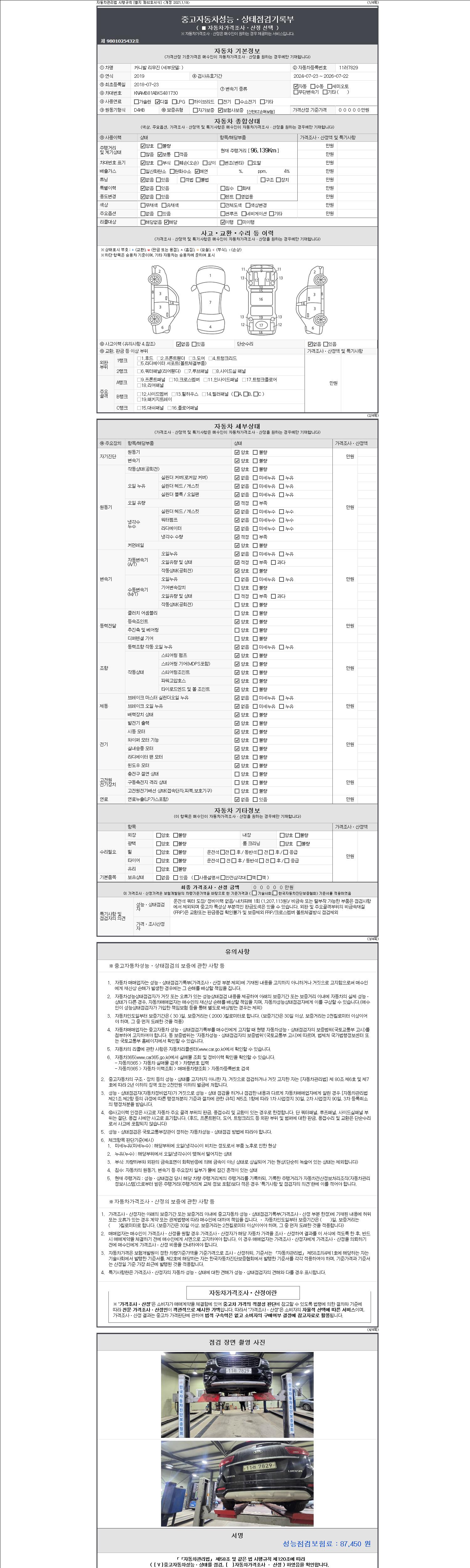 자동차관리법 시행규칙 제120조의 규정에 따라 별지 제 82호서식 《중고자동차 성능, 상태점검 기록부》를 발행한 성능, 상태점검자 및 매매자는 아래의 보증기간 또는 보증거리 이내의 중고자동차, 성능점검 기록부에 기재된 내용과 자동차의 실제 성능, 상태가 다른 경우 계약 또는 관계법령에 따라 매수인에 대하여 책임을 집니다.
