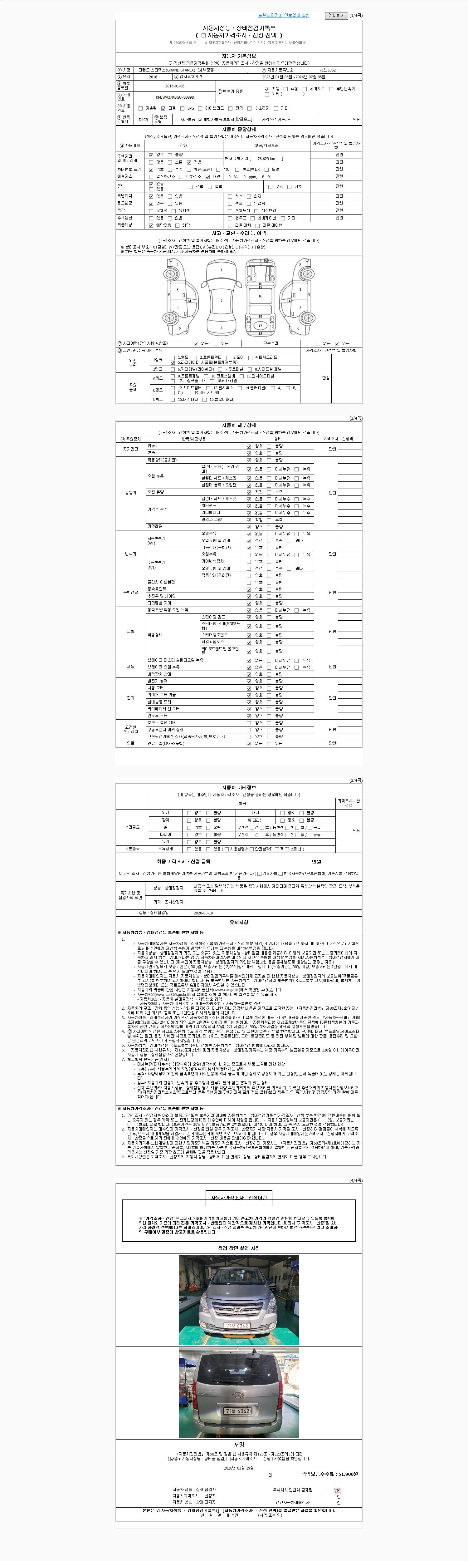 | 주행거리 | 76,629 km | 차량번호 | 71보6362 | 사고유무 | 성능기록부 참조 | 제시번호 | 제 2026014495 호 |