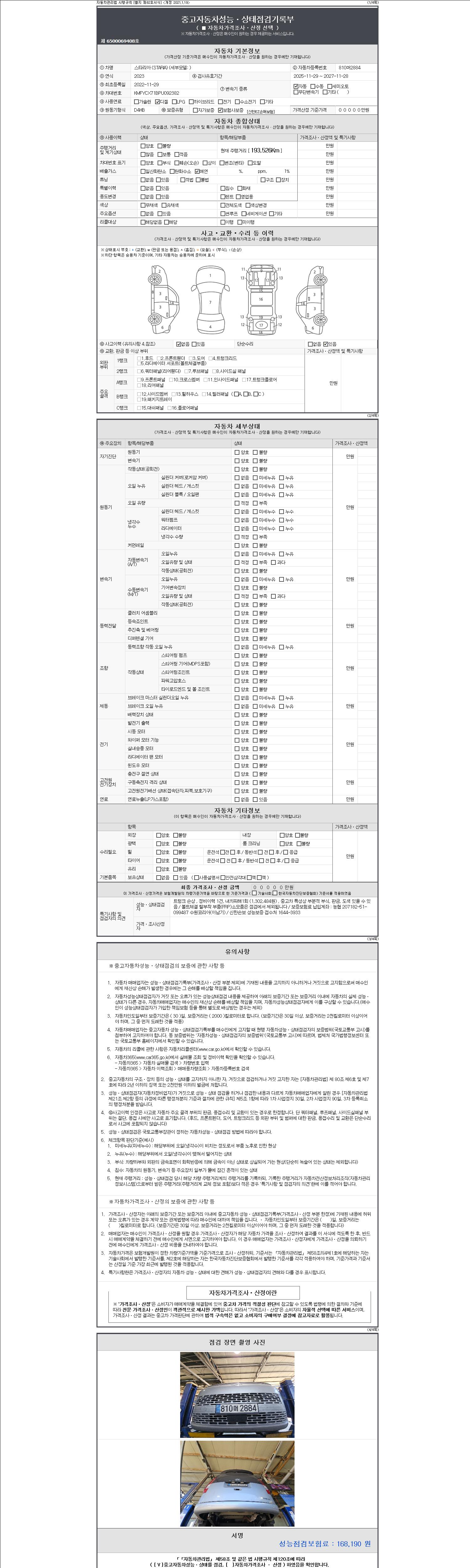 | 주행거리 | 193,526 km | 차량번호 | 810머2884 | 사고유무 | 성능기록부 참조 | 제시번호 | 제 2147483647 호 |