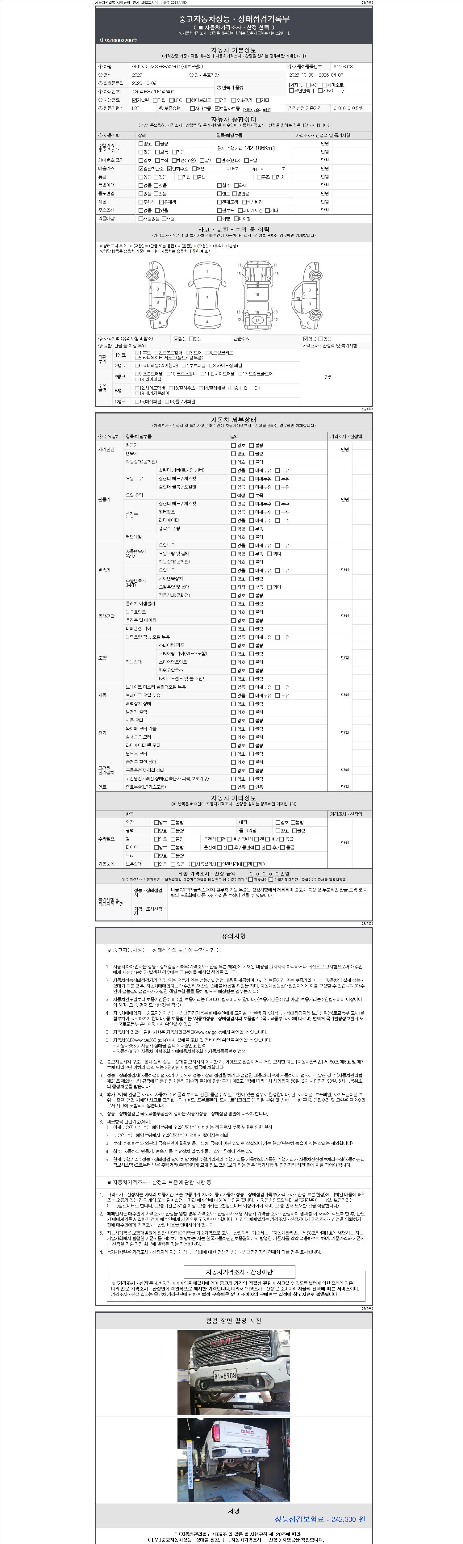 자동차관리법 시행규칙 제120조의 규정에 따라 별지 제 82호서식 《중고자동차 성능, 상태점검 기록부》를 발행한 성능, 상태점검자 및 매매자는 아래의 보증기간 또는 보증거리 이내의 중고자동차, 성능점검 기록부에 기재된 내용과 자동차의 실제 성능, 상태가 다른 경우 계약 또는 관계법령에 따라 매수인에 대하여 책임을 집니다.