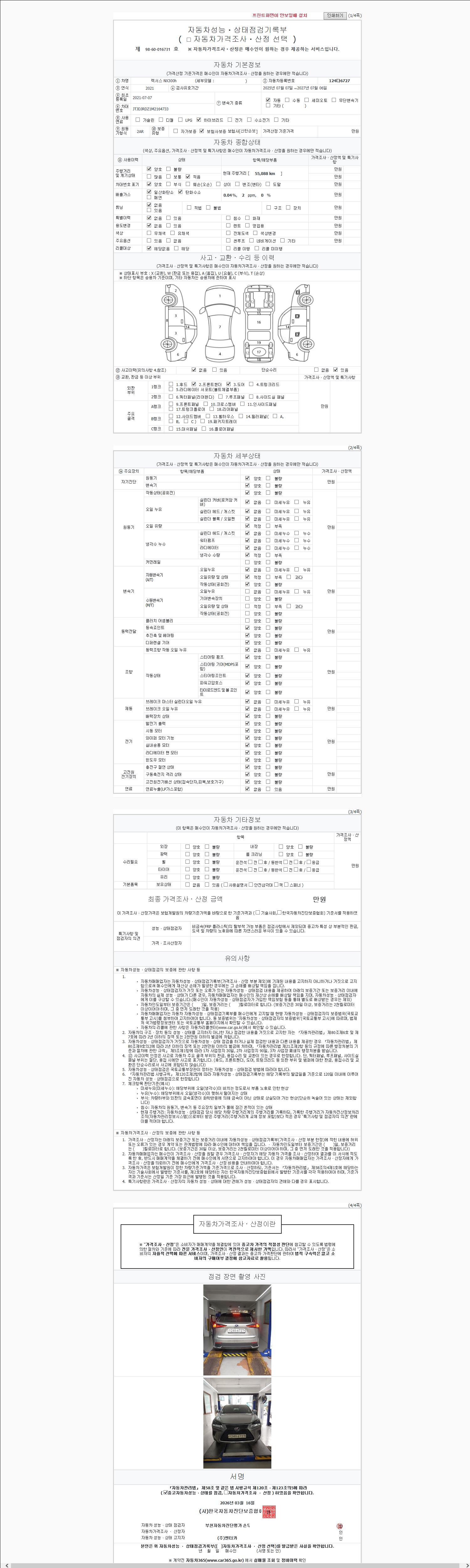 | 주행거리 | 55,088 km | 차량번호 | 124다6727 | 사고유무 | 성능기록부 참조 | 제시번호 | 제 2026034523 호 |