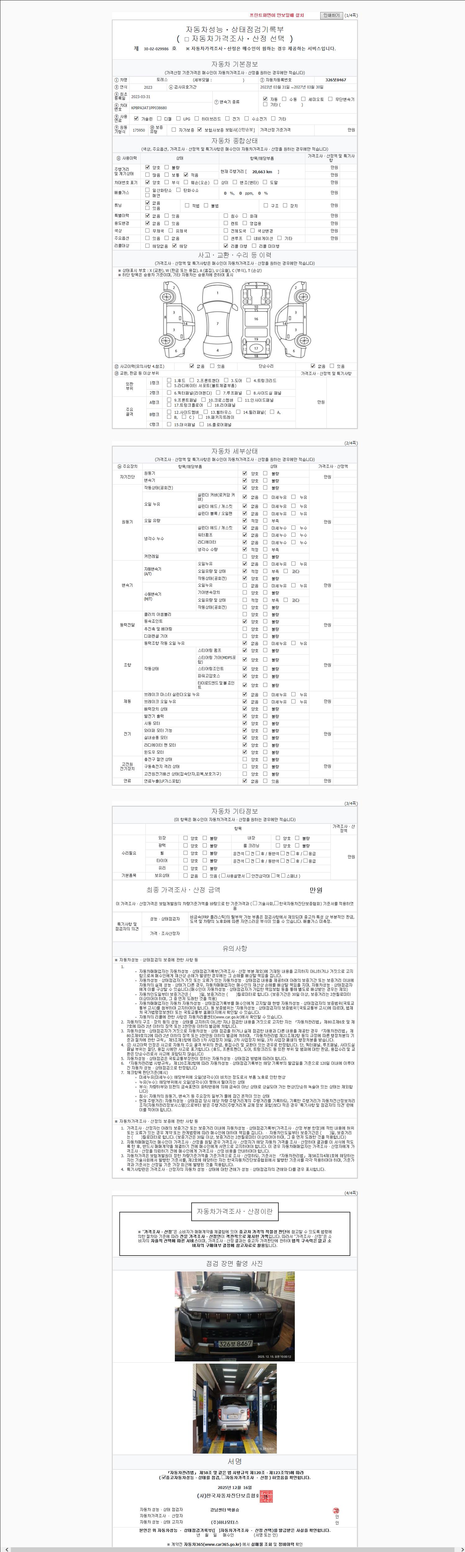 | 주행거리 | 20,663 km | 차량번호 | 326보8467 | 사고유무 | 성능기록부 참조 | 제시번호 | 제 2025169897 호 |